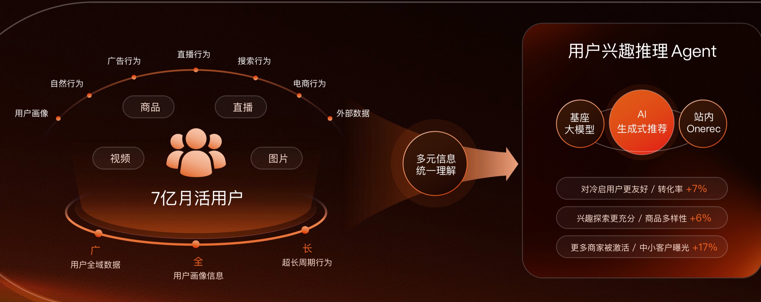 首先是与用户打交道的能力。快手拥有超过7亿的月活用户,他们在平台上浏览、搜索、看视频、与商品互动——这些行为过去是分散理解的。如今,用户兴趣推理Agent通过AI生成式推荐技术,将这些信息全部汇总、统一理解,不仅拓宽了兴趣理解的广度,还结合用户的行为序列做深度预测,挖掘消费的深层需求。效果是什么?新用户更容易被探索到,老用户能看到更丰富的推荐品类。种草和交易实现了打通,AI不再用预设的规则去定义“用户喜欢什么”,而是从真实行为里推理发现。