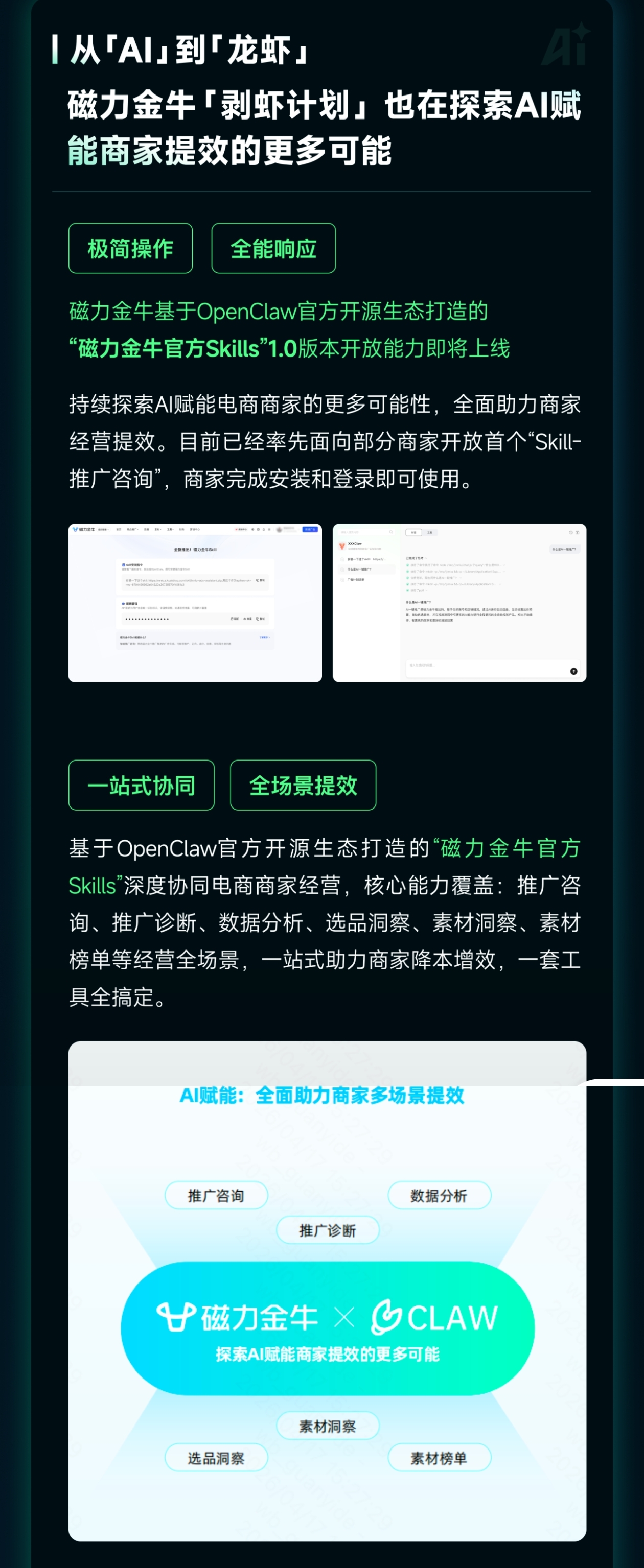 值得关注的是,磁力金牛还基于OpenClaw官方开源生态打造了专属“磁力金牛Claw Skill” ,后续将覆盖推广咨询、投放诊断、实时数据分析、选品与素材洞察等全经营链路。简单来说,商家将拥有一个真正懂电商投放的AI助手——基于历史投放数据、平台知识库和AI能力,它可以主动答疑、诊断投放问题、给出优化建议,甚至完成一键推广,就像一个7×24小时在线的投放专家。